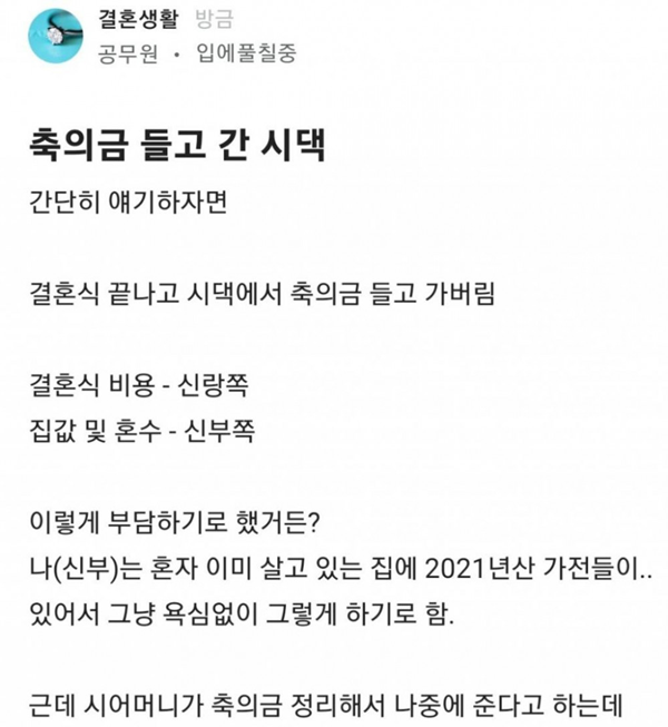 실시간 논란 중인 축의금 들고 간 시댁 가족