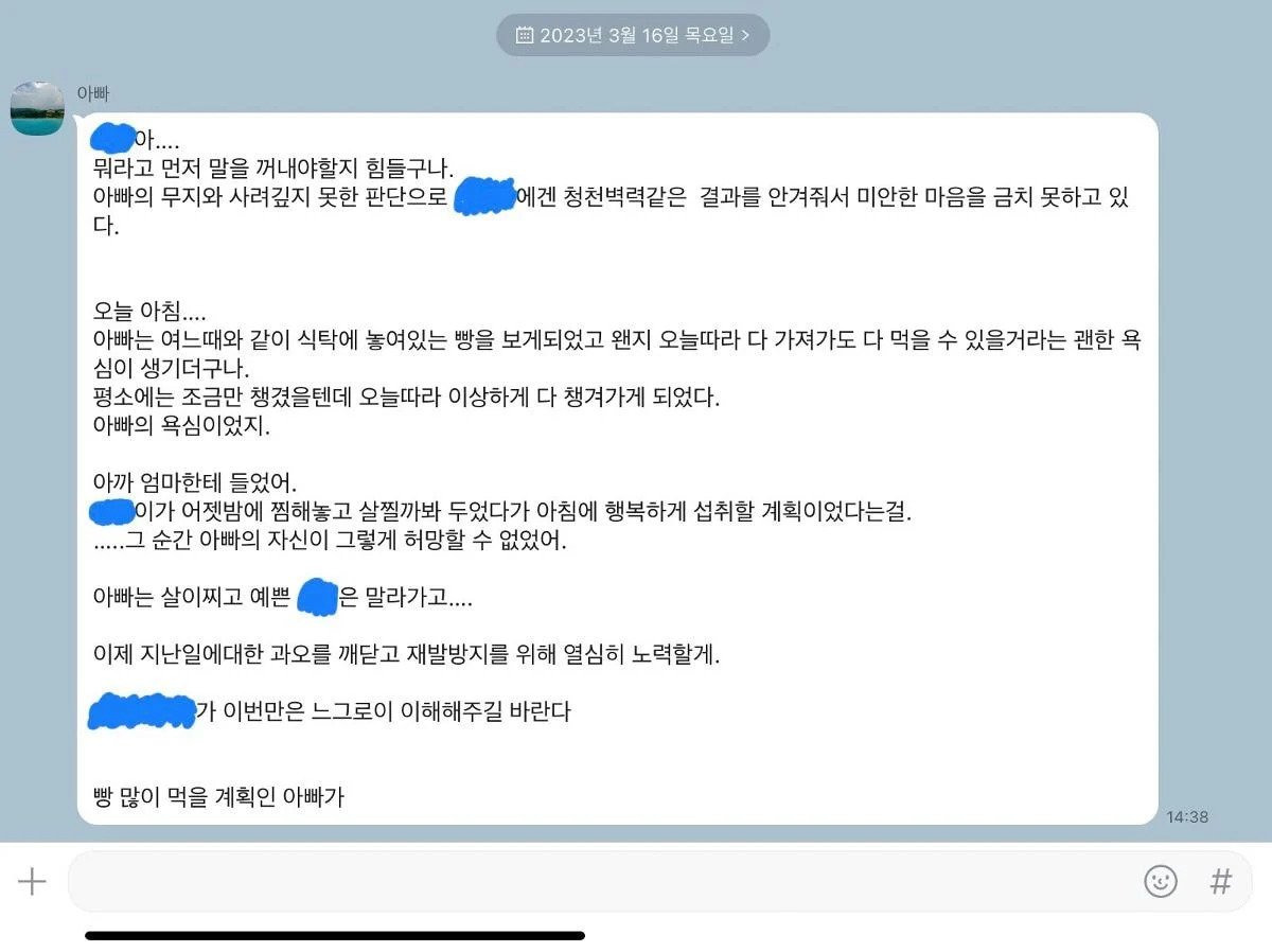 실수로 딸의 아침밥을 가져가버린 아빠의 진심어린 사과문