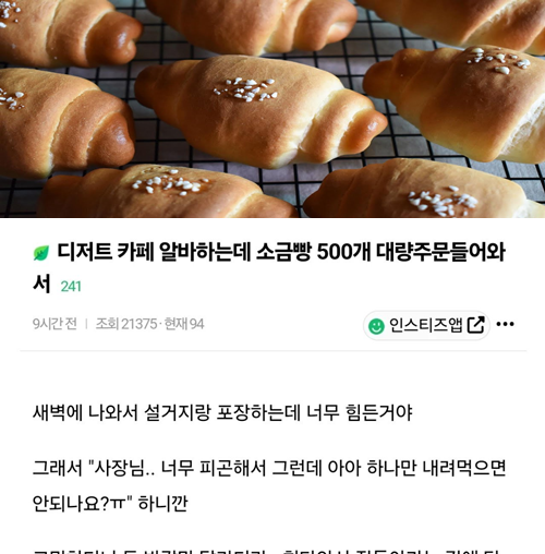 카페 알바하는데 소금빵 500개 대량 주문들어와서