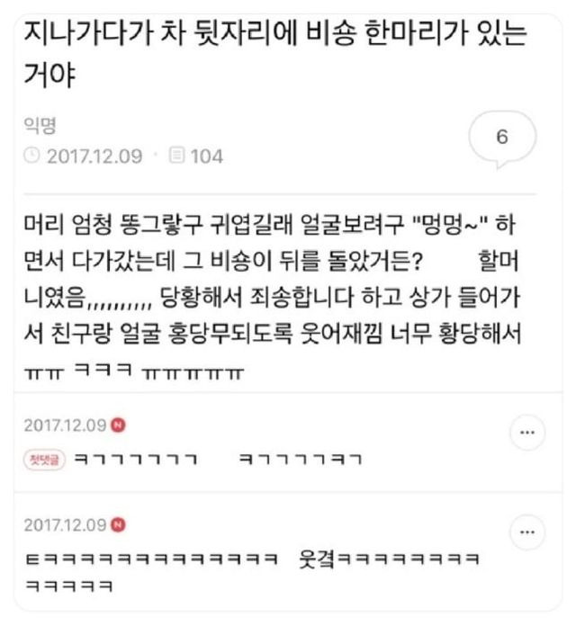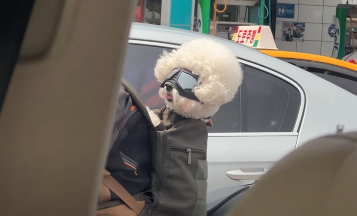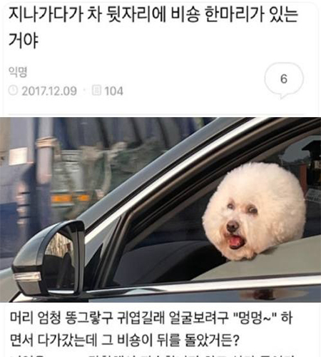 도로에서 차 뒷자리에 비숑 한마리가 있는거야 ㅋㅋ