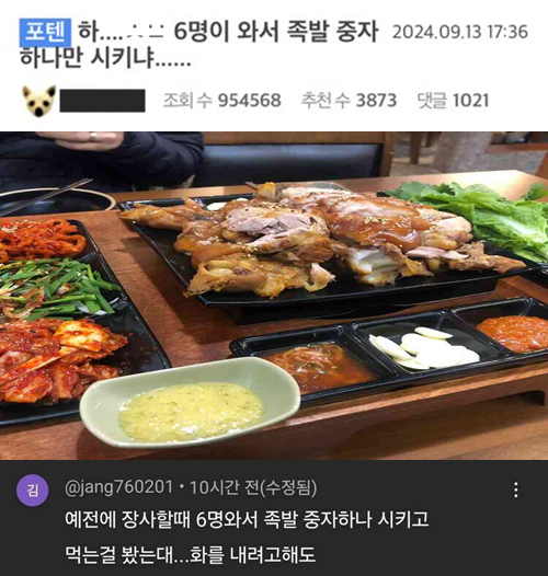 하….6명이 와서 족발 중자 하나만 시키냐…..