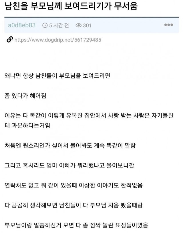 남친을 부모님께 보여드리기가 무서움