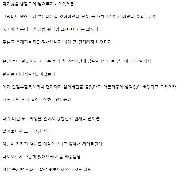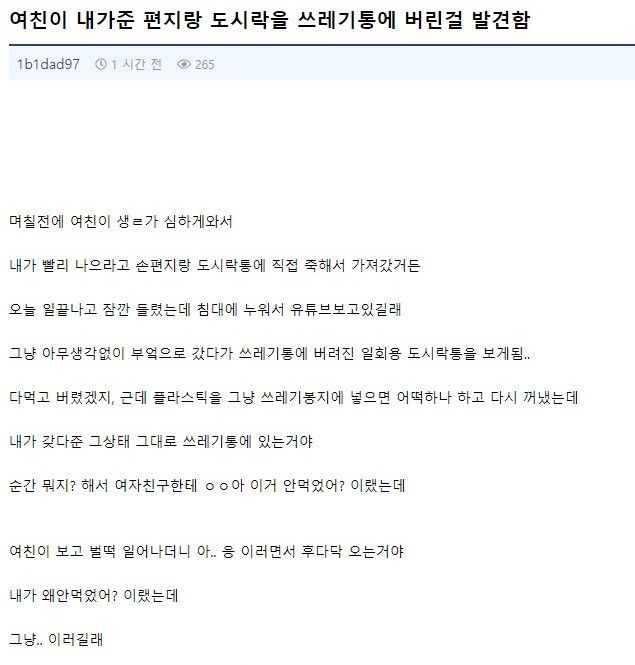 여친이 내가 준 편지랑 도시락 버린거 발견함