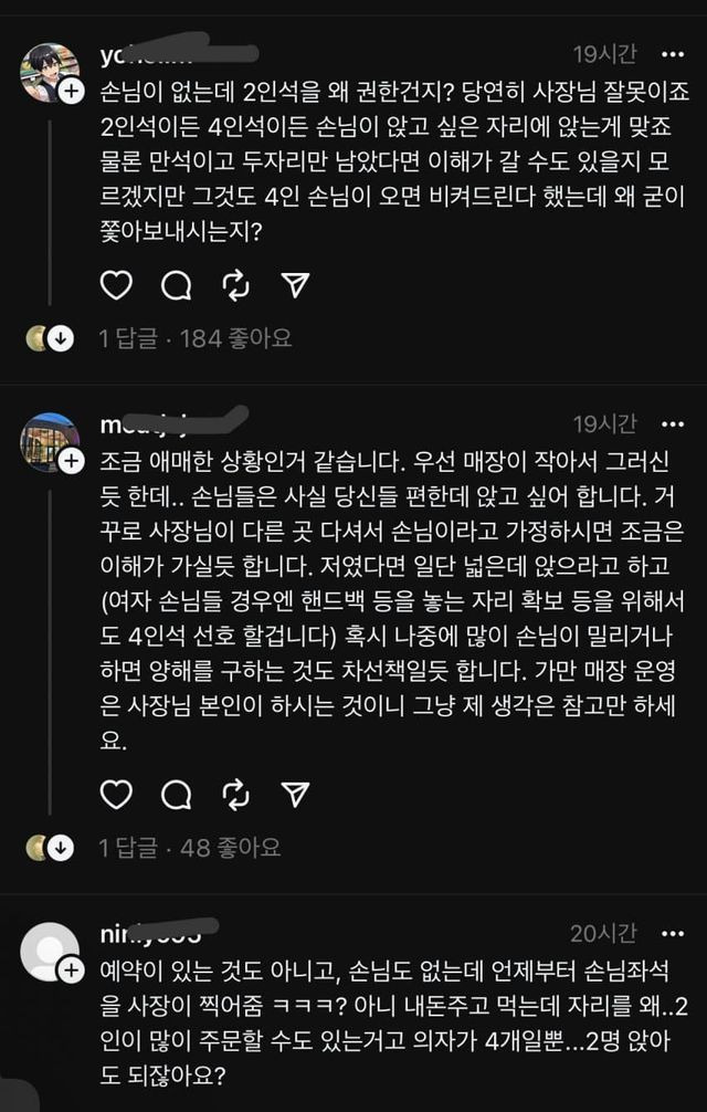 현재 SNS에서 논란중인 식당좌석배치 사장손님다툼