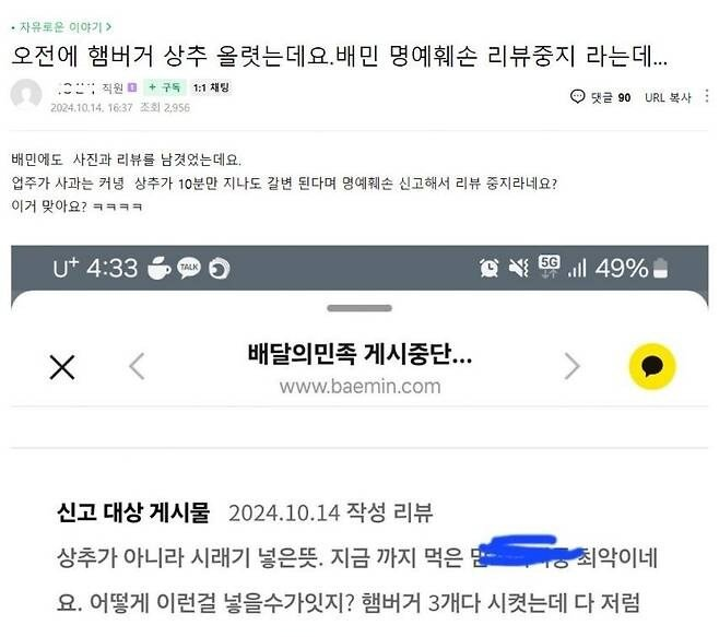 햄버거 리뷰 올렸다가 리뷰 중지 당한 손님