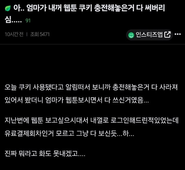 엄마가 내꺼 웹툰 쿠키충전해놓은거 다써버림