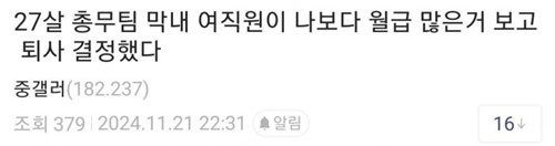 6년차 대리가 막내보다 월급 적어서 퇴사 결정한 중갤러