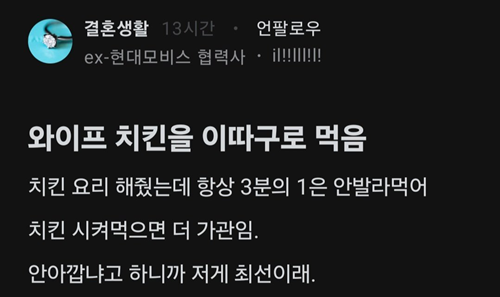 와이프가 치킨을 이따구로 먹음
