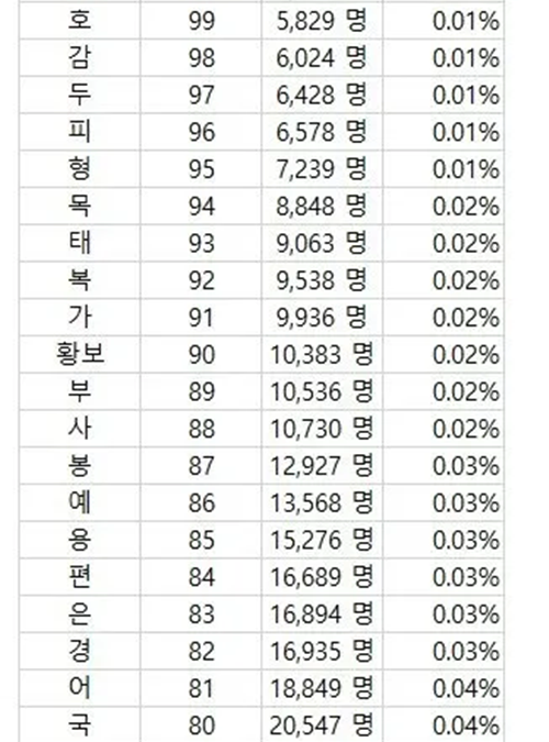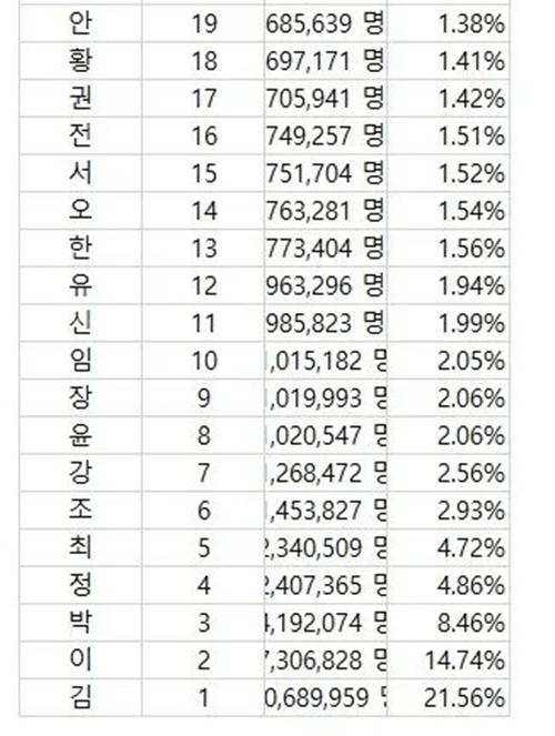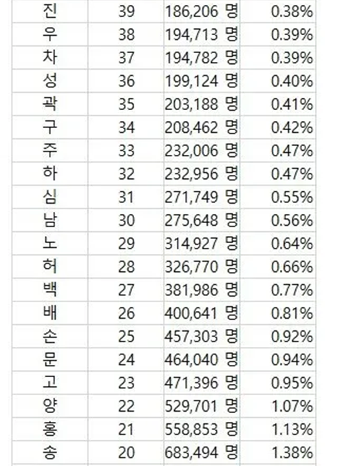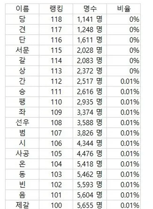 한국에 거의 없다는 성씨 희소순위
