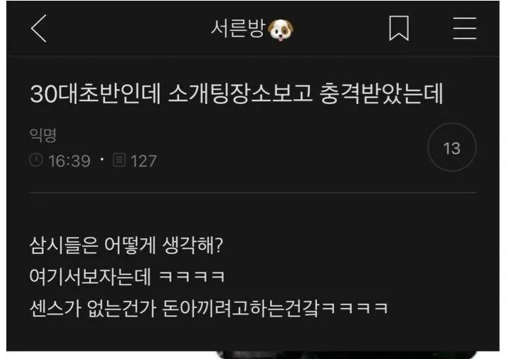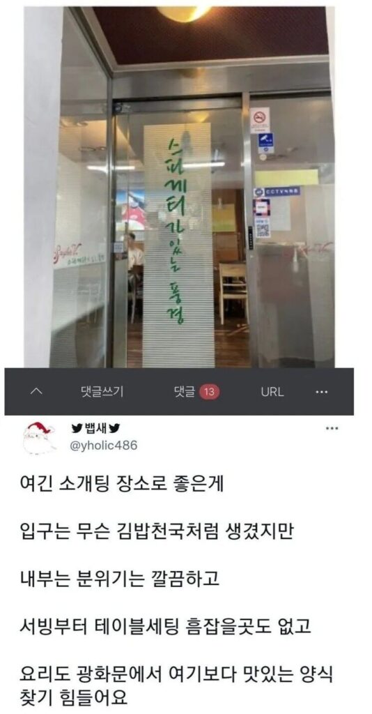 소개팅 장소 보고 충격먹은 여시녀 09/04/2025 이 포스팅은 쿠팡 파트너스 활동의 일환으로, 이에 따른 일정액의 수수료를 제공받습니다. 당겨주세요! 당겨주세요! 광고 방문하고 계속 읽기 원치 않을 경우 뒤로가기를 눌러주세요 X