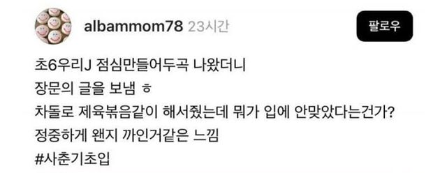 초6 아들에게 밥해준 엄마가 받은 카톡 09/19/2025 이 포스팅은 쿠팡 파트너스 활동의 일환으로, 이에 따른 일정액의 수수료를 제공받습니다. 당겨주세요! 당겨주세요! 광고 방문하고 계속 읽기 원치 않을 경우 뒤로가기를 눌러주세요 X