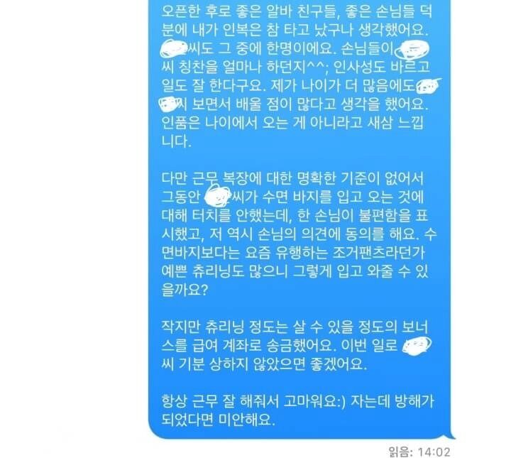 수면바지 입는 알바에게 문자보낸 점장님