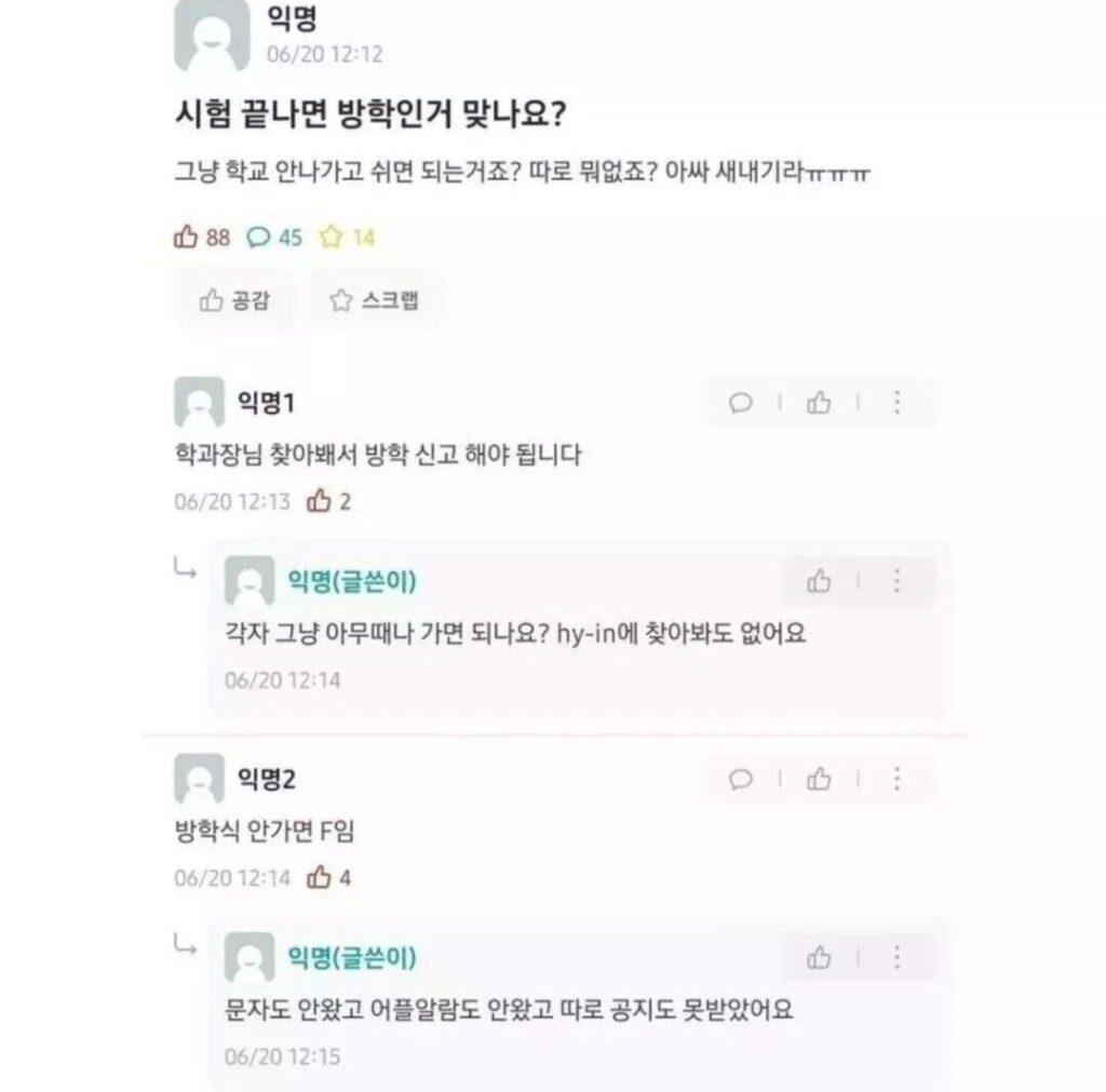 방학식 못 가서 F 받게 생긴 새내기